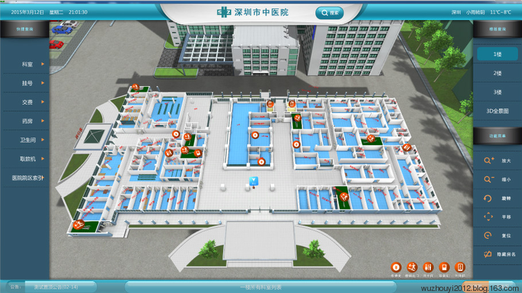 觸摸查詢機還可由為患者提供該醫(yī)院各樓層科室分布的電子地圖導引指示,可以采用2D或3D圖像形式生動直觀得進行線路的指引。