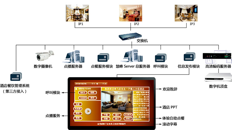 酒店現(xiàn)在具備的功能設(shè)施越來越豐富,包含餐飲、住宿、會展、慶典活動、會議、健身、環(huán)境體驗等等,而酒店功能區(qū)包括大堂、購物商場、休息等候區(qū)、豪華包廂、會議廳、宴請廳、健身廳等等,而“信息交互與發(fā)布系統(tǒng)”的目的,就是讓顧客從進入酒店的那一刻起,就可以享受到完美的信息化服務(wù),并帶給顧客智能、便捷、高檔次的享受與體驗。根據(jù)賓館酒店實際應(yīng)用情況,我們建議在大堂、會議室門口、電梯間、貴賓廳、包房等區(qū)域進行液晶信息展示和指示。
