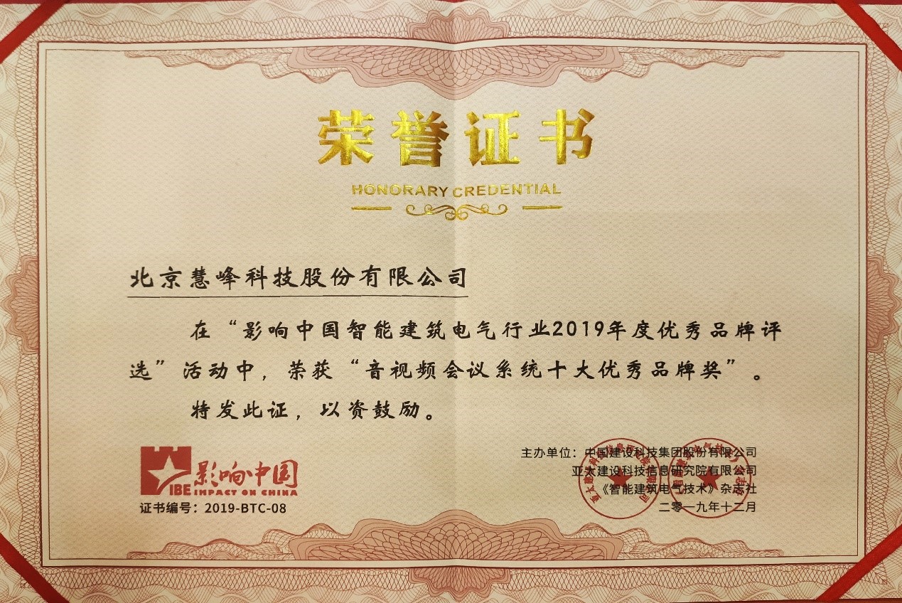 2019年12月20日第八屆「影響中國」智能建筑電氣行業(yè)優(yōu)秀品牌評(píng)選頒獎(jiǎng)典禮在北京華麗落幕。智能建筑行業(yè)協(xié)會(huì)的領(lǐng)導(dǎo)、專家評(píng)委、優(yōu)秀品牌廠商代表、媒體代表等齊聚一堂,共同見證了此次頒獎(jiǎng)盛典?;顒?dòng)組委會(huì)從參評(píng)的全國智能建筑電氣行業(yè)的465個(gè)參評(píng)品牌評(píng)選出“十大系統(tǒng)優(yōu)秀品牌獎(jiǎng)”,慧峰科技榮獲“音視頻會(huì)議系統(tǒng)優(yōu)秀品牌獎(jiǎng)”,這是繼慧峰科技2019年12月19日榮獲“2019年中國弱電運(yùn)維行業(yè)音視頻服務(wù)企業(yè)十大品牌獎(jiǎng)”之后的又一殊榮。