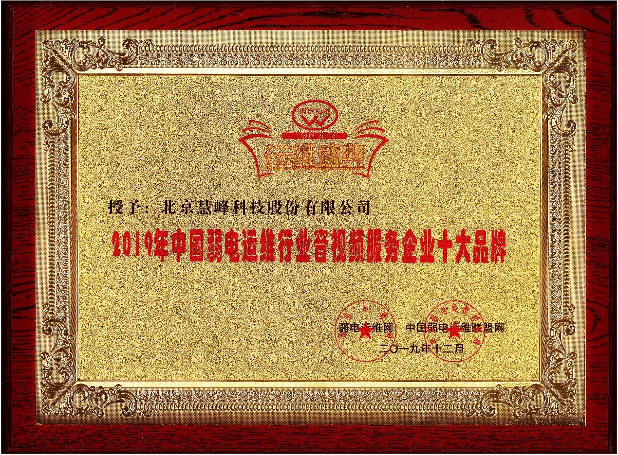 慧峰科技榮獲“2019年中國(guó)弱電運(yùn)維行業(yè)音視頻服務(wù)企業(yè)十大品牌獎(jiǎng)” | 2019-12-23 |